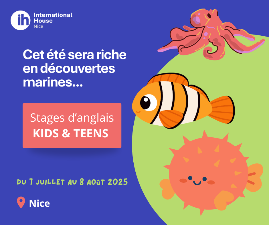 Following on from the United Nations Ocean Conference, which will take place in our beautiful city of Nice from June 9 to 13, 2025, International House Nice will be organizing intensive English courses for children from July 7 to August 8. Through fun and entertaining activities conducted entirely in English, your children will have a great time while improving their English skills!